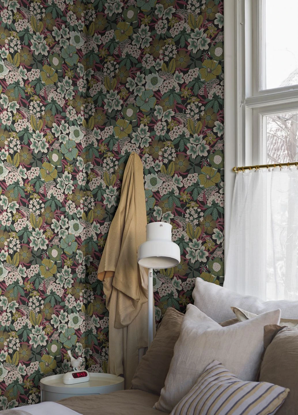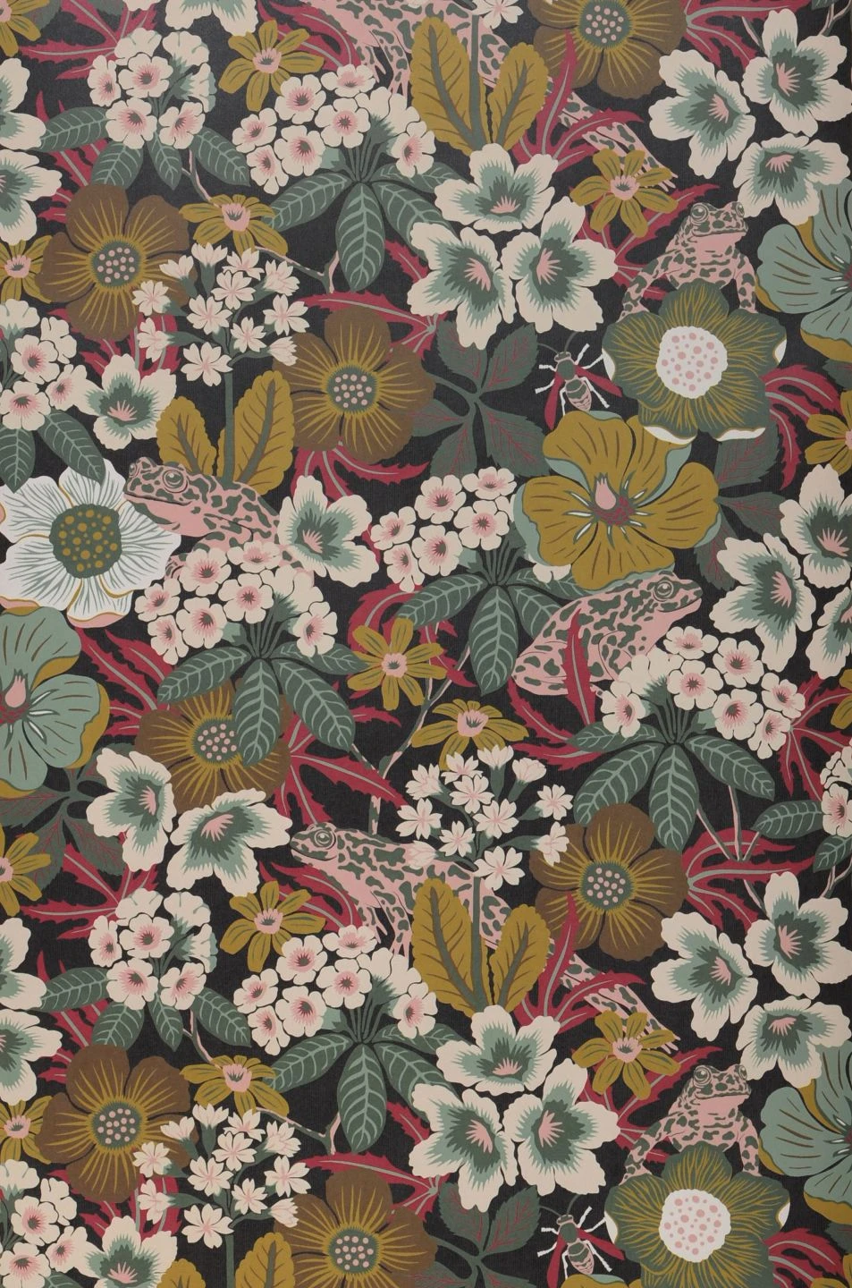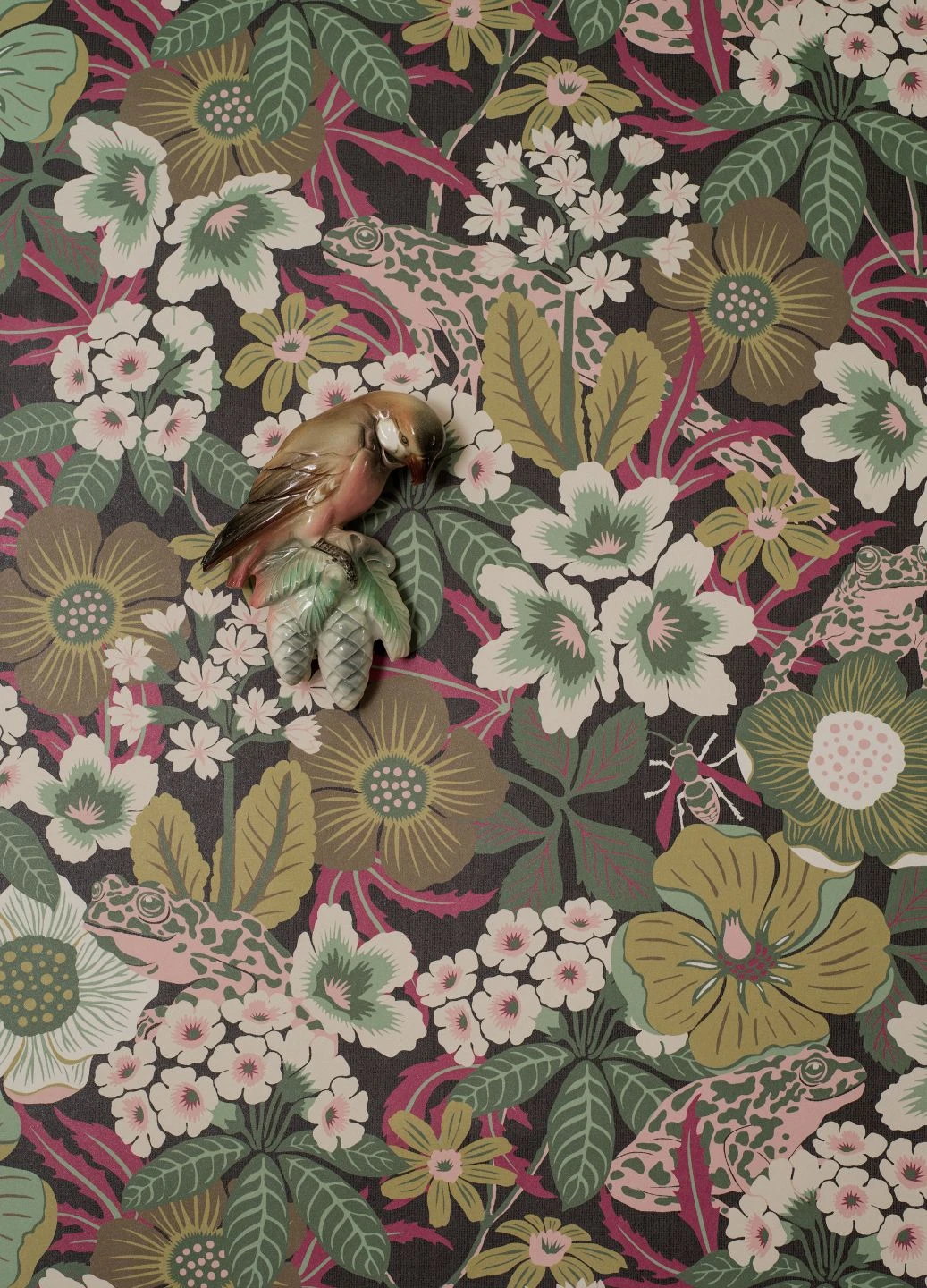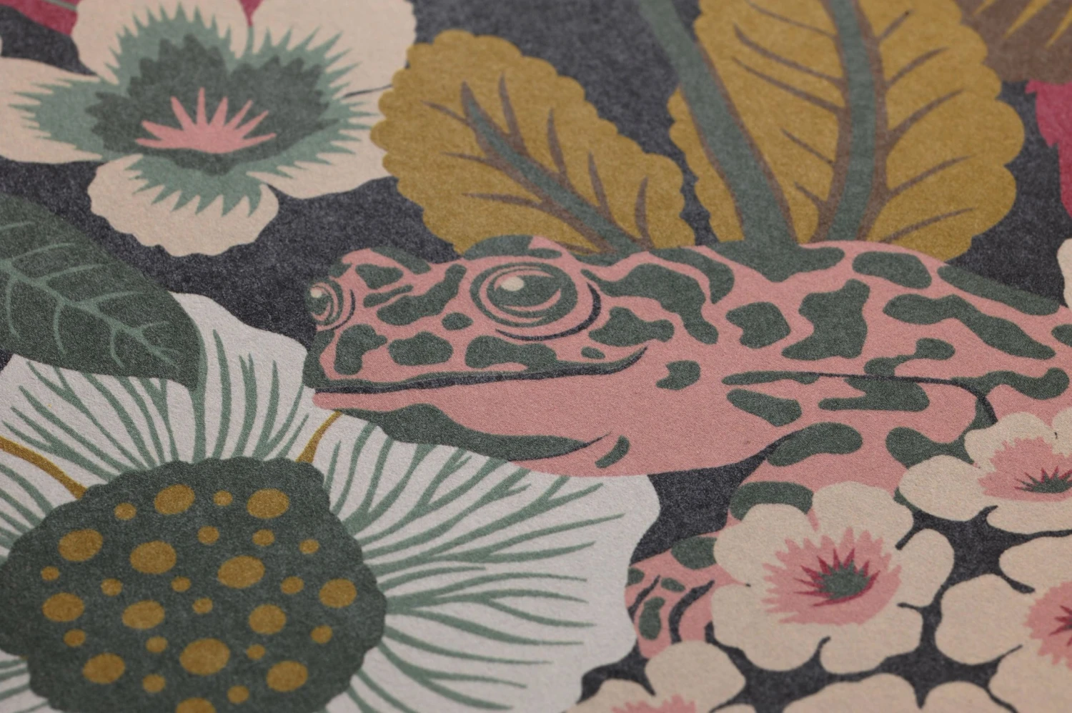 Auf den ersten Blick zeigt Vliestapete Adelia ein üppiges Blütenmeer in perfekt miteinander harmonierenden Ocker-, Grün- und Rosatönen. Erst bei genauerem Hinsehen erkennt man, dass da noch mehr ist: Zwischen den dicht wachsenden Blüten verbergen sich Frösche, deren Hautmuster sie im Blumenmeer beinahe verschwinden lässt, und Insekten. Das Spiel mit der Tradition der floralen Tapete ergibt einen attraktiven Hingucker mit Augenzwinkern.