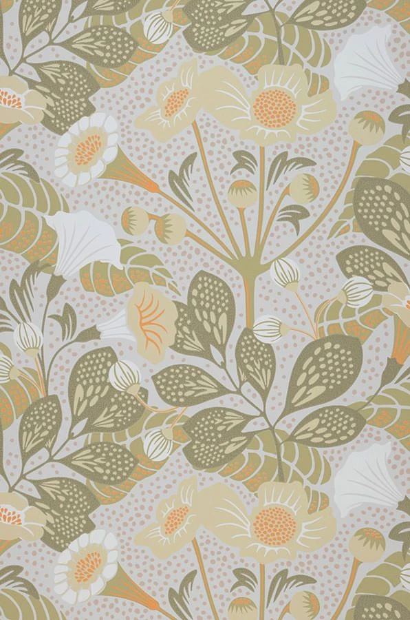 Elfenbein, Olivgelb, Olivgrau, Weiss lassen die stilisierten Trompetenblumen samt Blattwerk leichtfüßig, rein und klar in den Raum wachsen. Die feinfühlige Vliestapete mit floralem Muster ist ein herrliches Sinnbild für jeden neuen Tag, der zum Leben erwacht und daher ideal für Räume, in denen Sie sich anregende Energie wünschen.