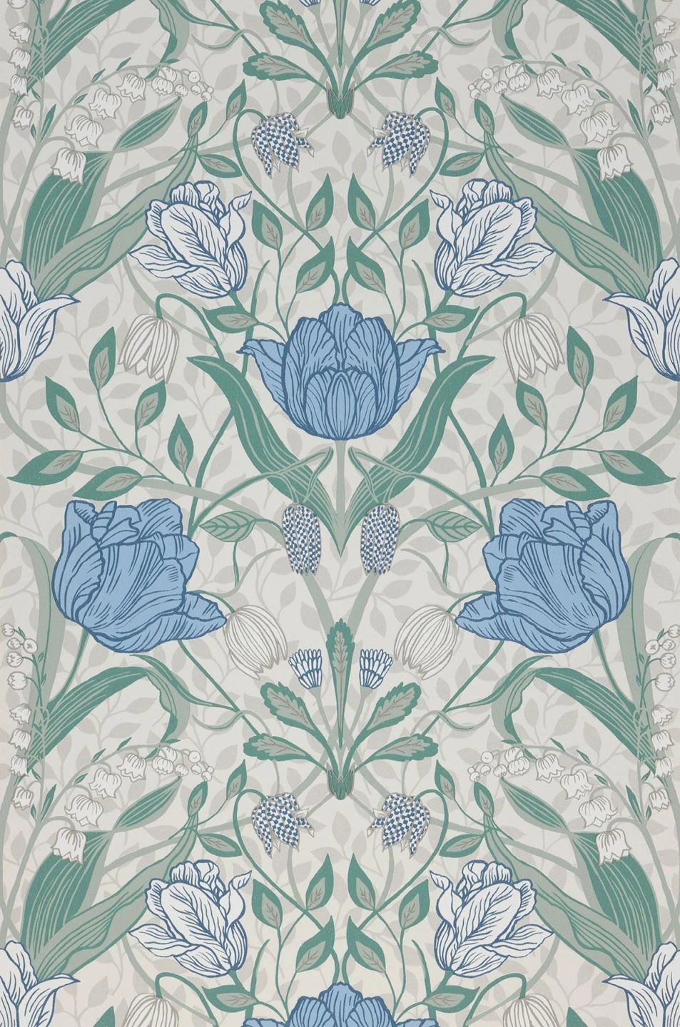 Das klassische Blumen-Ornamentmuster in Graublau, Mintgrau, Minttürkis, Taubenblau, Weiss wirkt auf dem cremeweißen Grund majestätisch erhaben. Der Blütenbarock lässt grüßen und bietet Gestaltungsoptionen in Flur, Treppenhaus, Schlafzimmer, Speisezimmer.