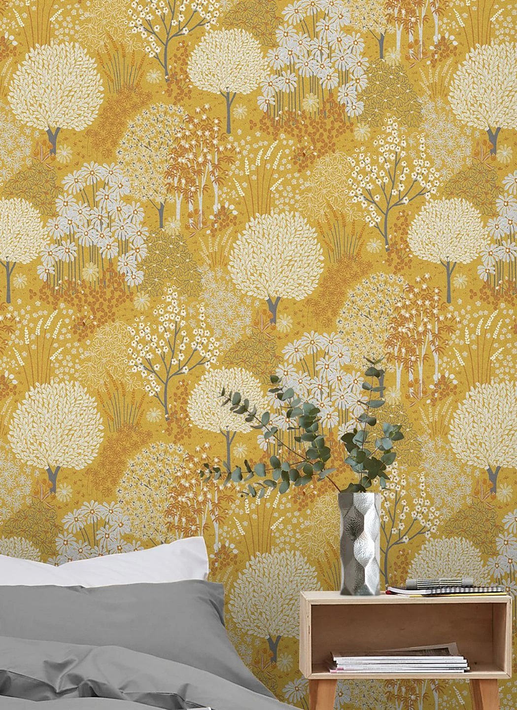 Durchflutet vom Sonnenlicht sind die blühenden Bäume, Blumen und Gräser auf dem goldgelben Grund. Ihre Farben – helle Gelb- und Grautöne und Weiß – tragen zu dem Eindruck eines strahlenden Sommertags bei. Die zarten Farbtupfer, aus denen sich die Pflanzen zusammensetzen, wirken wie handgemalt und machen Aurora zu einer freundlich-sonnigen Kulisse für Ihre Einrichtung im skandinavischen Stil, im Landhaus-Stil oder mit ausdrucksvollen Retro-Möbeln.