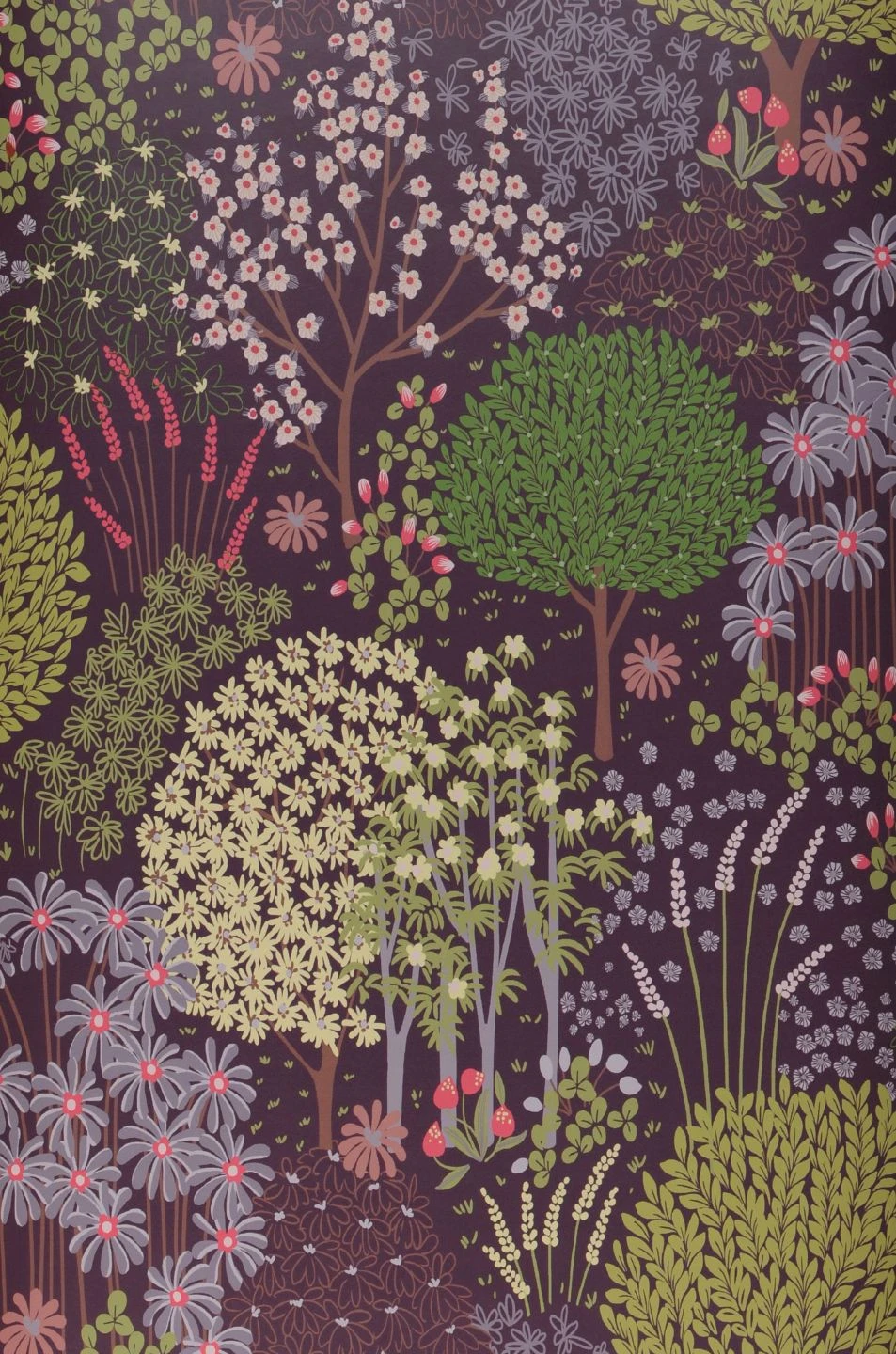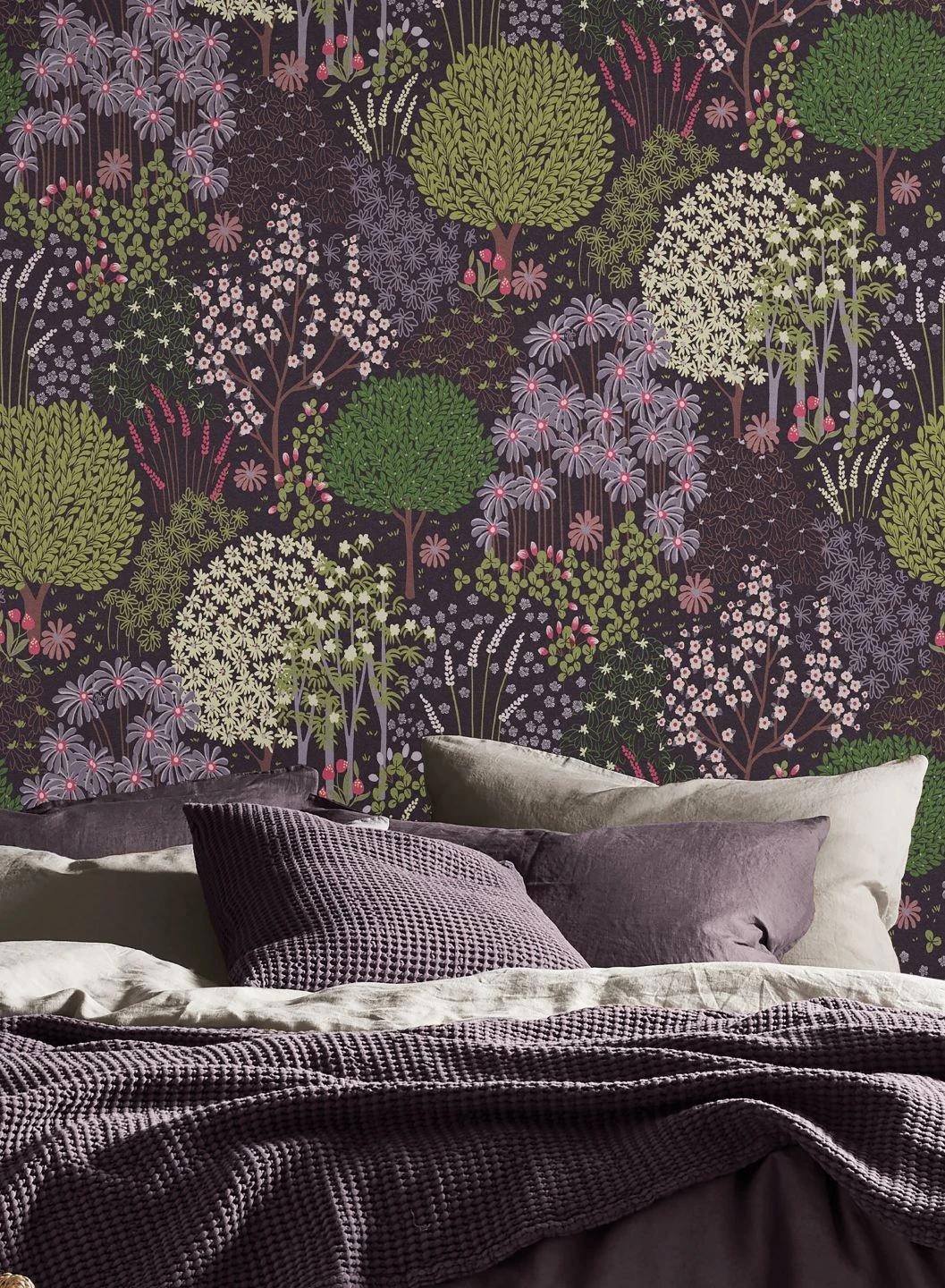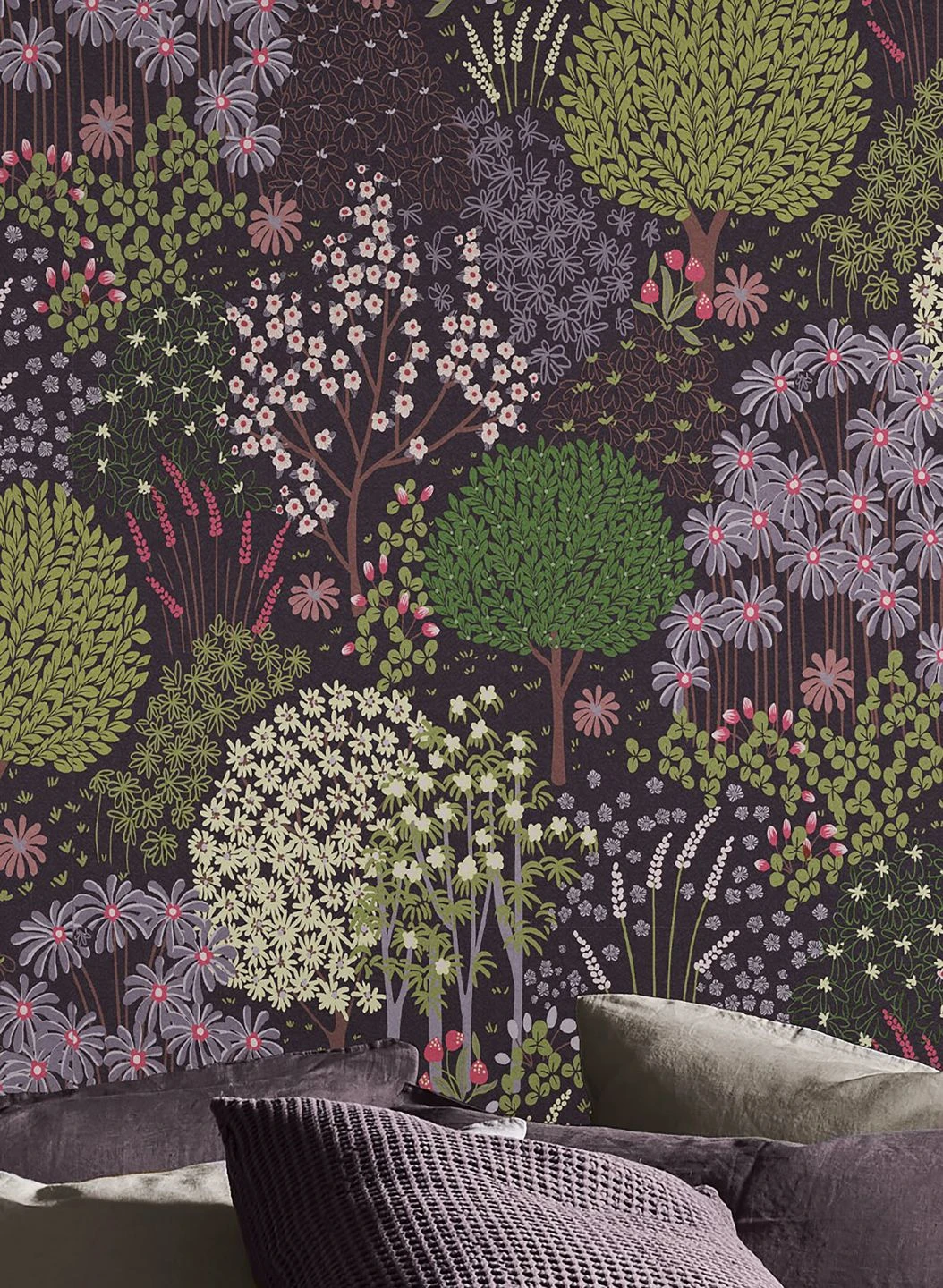 Blühende Bäume, mit zierlichen Blüten übersäte Wiesen, dazwischen Blumen der unterschiedlichsten Formen – Aurora zeigt eine geradezu paradiesisch anmutende Fantasielandschaft im Frühling. Die Farbenpracht der Blüten und Blätter ist mit Bedacht gewählt, denn Braun, Erdbeerrot, Gelbgrün und Grauviolett bilden zusammen mit dem Purpurviolett des Untergrunds einen stimmigen Farbraum. Mit einer der passenden Farben als weitere Wandfarbe oder in Ihren Einrichtungselementen unterstreichen Sie die angenehme Ausstrahlung.