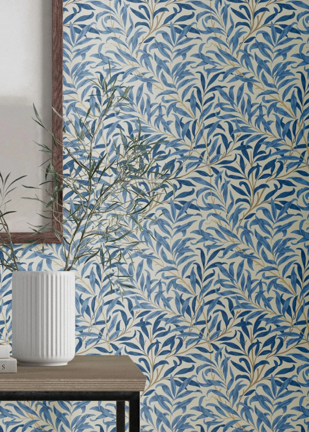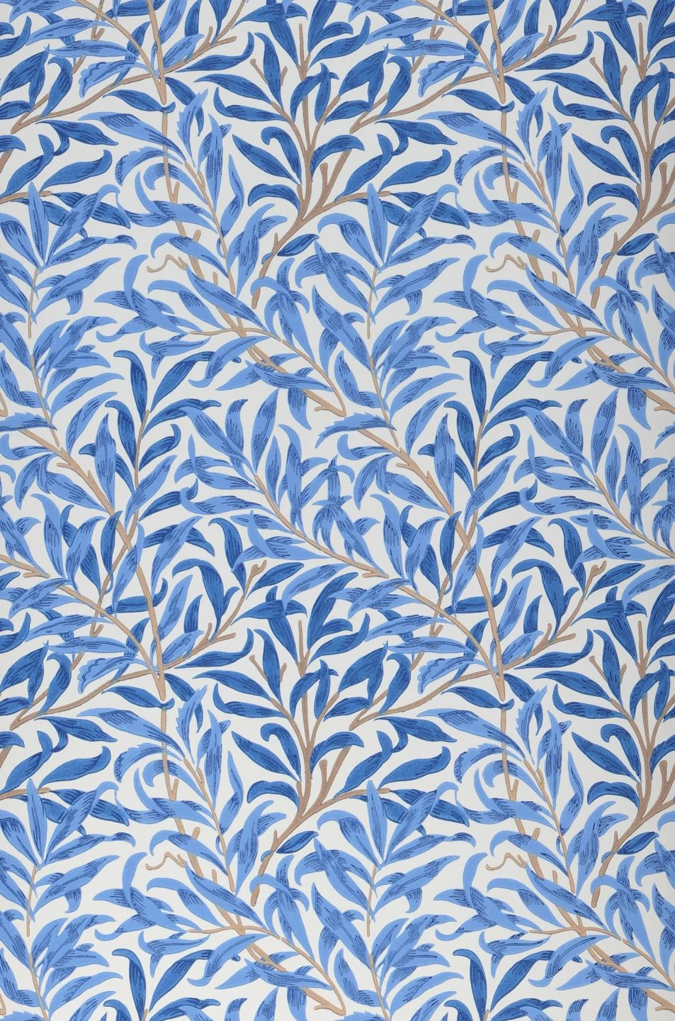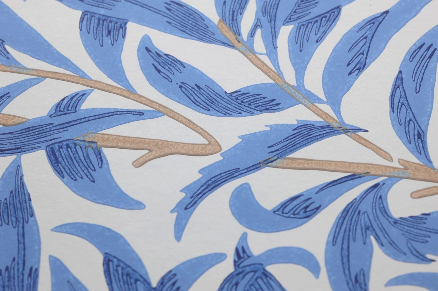 Die schlanken Blätter der Weide bilden hier ein schützendes Dickicht. Abstufungen von hellem Blau auf dem weißen Grund ergeben einen Eindruck von Frische und angenehmer Kühle. Doch der besondere Zauber dieses Tapetenmusters steckt im Detail: Durch Linien und Schraffuren in einem dunkleren Blauton, die die Formen der Blätter betonen, wirken diese besonders naturgetreu, so als würde eine sanfte Brise sie bewegen.