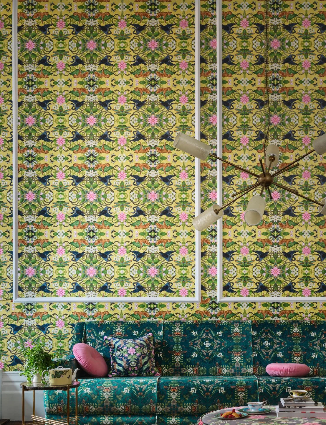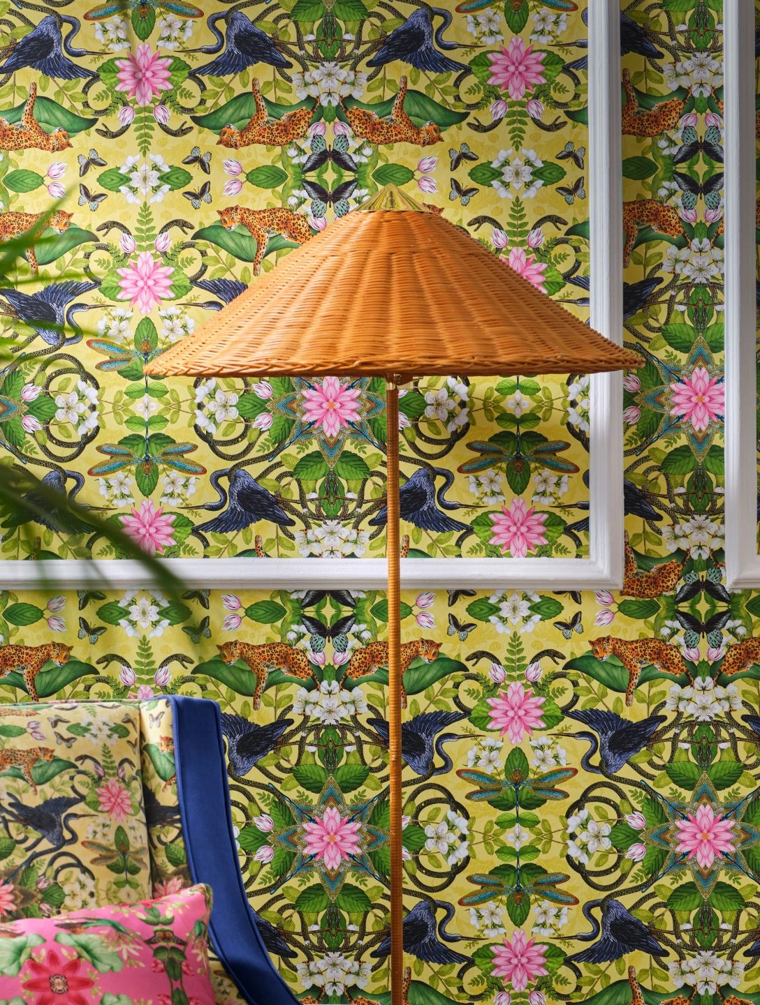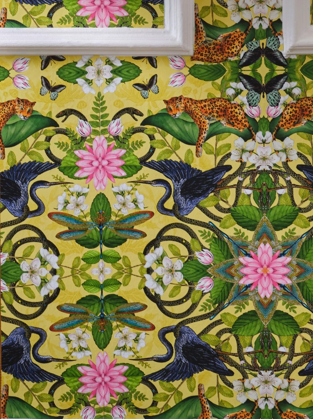 Leoparden räkeln sich auf riesigen Lotusblättern. Schlangen winden sich um Blumen herum. Schmetterlinge, Libellen und Kraniche bilden mit Blüten und Blättern symmetrische Arrangements wie in einem Kaleidoskop. Mit ihrem ausgefallenen Design, das voller Überraschungen steckt, schmückt Evolutia Ihre Wand auf unterhaltsame Weise. Der Untergrund in Hellgelb und leicht schimmerndem Zitronengelb macht Ihren Raum zugleich hell und sonnig.