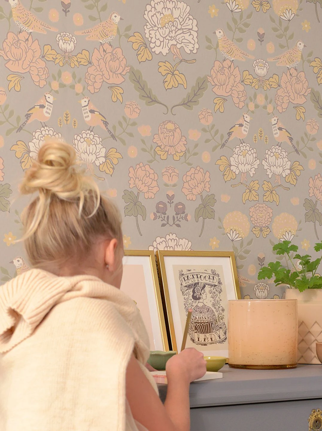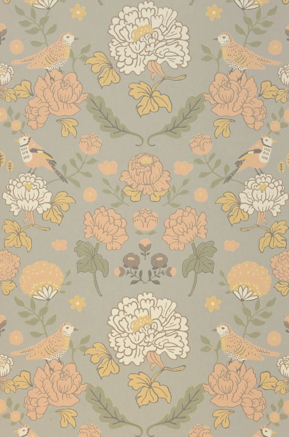 Große Blüten, Blätter und Vögel in Weiß, blassen Grün- und Orangetönen und Sandgelb folgen auf dem hellgrauen Grund der Vliestapete einer zugrundeliegenden Symmetrie. Das Design aus dem Hause Majvillan erinnert an klassische Tapetenentwürfe des britischen Künstlers und Designers William Morris, die es kunstvoll in die heutige Zeit überträgt. Konsequent passt dazu die Herstellung der Tapete im traditionellen Leimdruckverfahren.