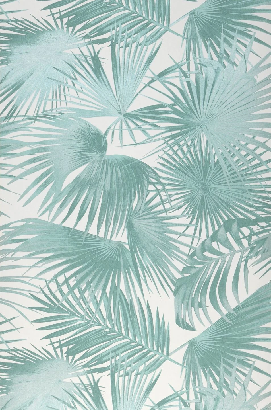 Kunstvoll wiegen sich die Palmwedel in Minttürkis ineinander, berühren sich sanft und lassen ausreichend Raum für das erhellende Cremeweiß. In Pastelltürkis Perlglanz getauchte Elemente verstärken den Lichteffekt zusätzlich. Selbst kleine und schmale Räume profitieren von dieser belebenden und weitenden Designtapete.