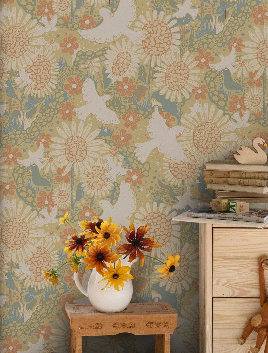 Weiße Vögel fliegen zwischen großen Sonnenblumen und verschiedenen kleineren Blumen und Blättern umher. Das Sandgelb, das den optischen Eindruck der Tapete beherrscht, passt wunderbar zu den Nuancen von Orange, Olivgrün und Pastellblau. Gerade für den skandinavischen Stil sind die charaktervollen Illustrationen eine künstlerische Ergänzung, die Ihr Heim gemütlich und sonnendurchflutet wirken lässt.