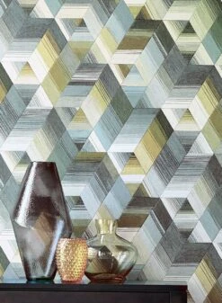 Wie in einer der berühmten Zeichnungen von M. C. Escher wird Ihre Wand mit dieser Tapete zu einer optischen Illusion dreidimensionaler Tiefe. Die raffinierte Anordnung der farbigen Streifen und Linien zu Dreiecken und Trapezen lässt räumliche Gebilde entstehen. Harmonisch ergänzen sich die Beige-, Grau- und Khakitöne. Die ausdrucksvolle Tapete verträgt charakterstarke Möbel in den passenden Farben.