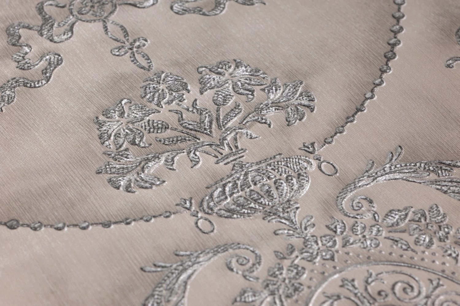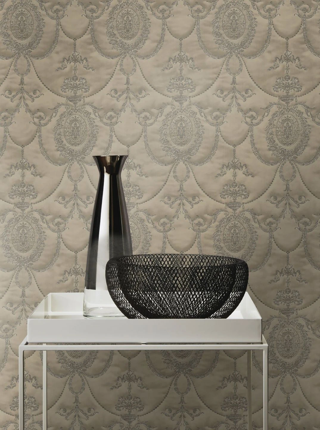 Ganz mühelos gelingt der Vliestapete Rabia die Gratwanderung zwischen klassischer Tradition und modernem Design. Denn das leicht schimmernde Hellbraungrau ist nicht nur angesagt, sondern erinnert zugleich an wertvolle Seidenstoffe. Die barocken Ornamente sind wie eine kostbare Stickarbeit in die unempfindliche Vinyloberfläche eingeprägt. Optisch wie haptisch entsteht der Eindruck eines luxuriösen und gleichzeitig vornehm zurückhaltenden Brokats.