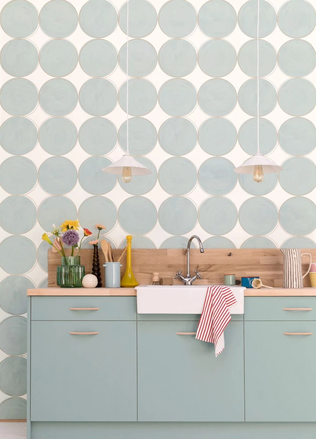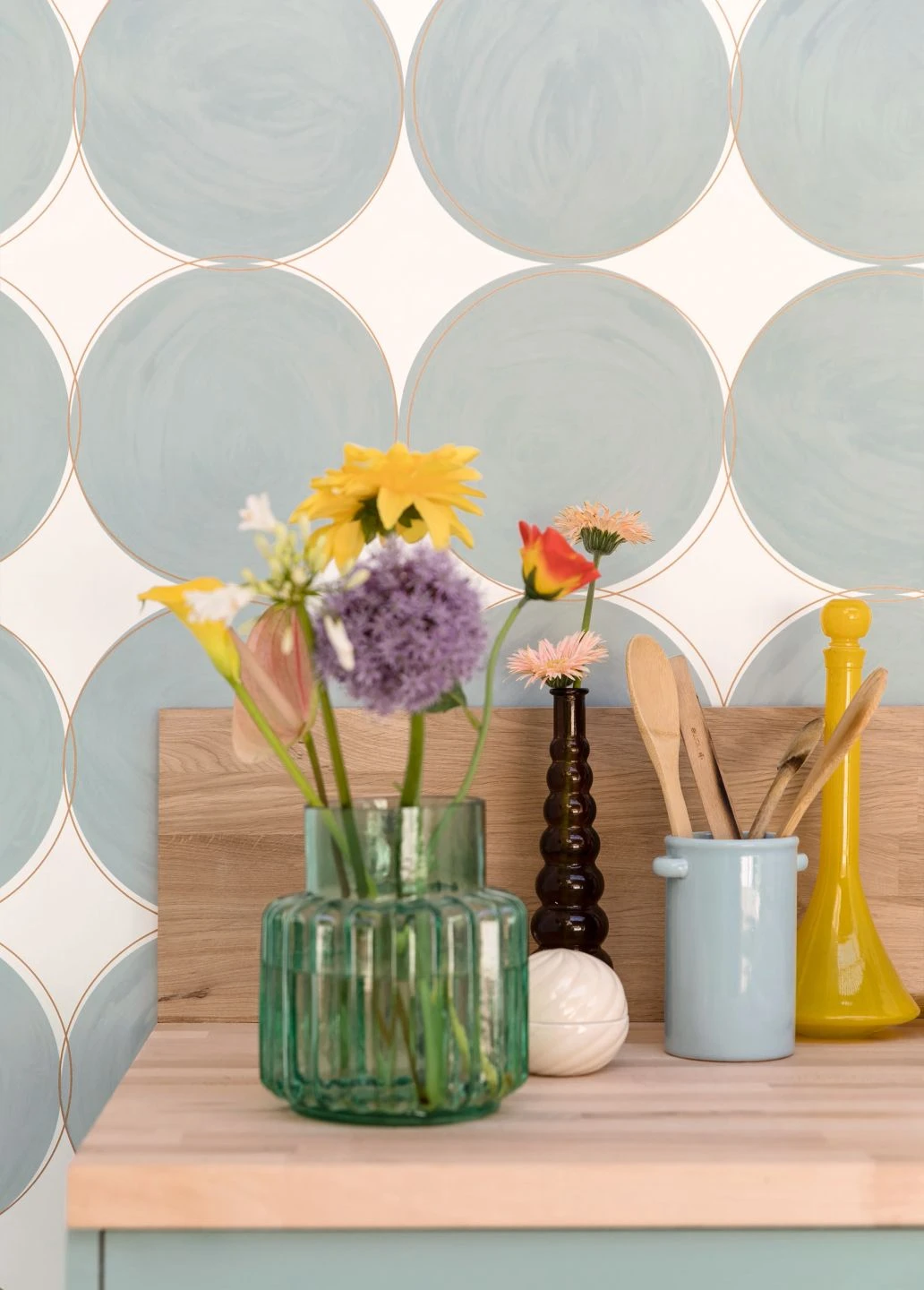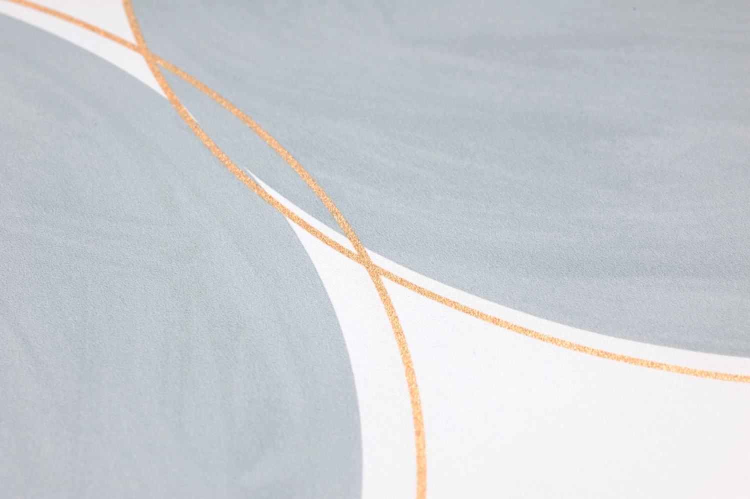 Das Muster aus großen Kreisen, deren Umrisse durch feine Bögen in Mattgold fast spielerisch betont werden, lässt der Ausdruckskraft des hellen Minttürkis, in dem die Kreise gehalten sind, viel Raum. Es entsteht ein faszinierendes, gleichzeitig zurückhaltend-kühles und elegant-verspieltes Design, dessen Charakter durch den wie großzügige Pinselstriche sichtbaren Farbauftrag betont wird. Mit Einrichtungselementen in den passenden Farben kombiniert, ist Rowan ein echter Hingucker.
