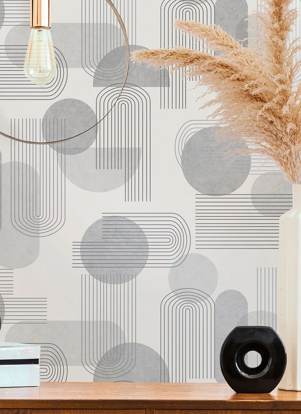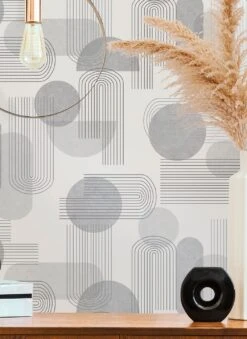 Hier bilden Farbe und Form eine perfekte Einheit: Kühle Grautöne und abstrakte Formen, wie sie aus der Ästhetik des Bauhaus stammen könnten, wirken zusammen und kreieren eine Tapete von zeitloser Eleganz. Silbern schimmernde Highlights sorgen für einen Hauch von Luxus. Die Papiertapete mit dem Retro-Schick ist ein toller Hintergrund für Möbel in den Non-Colors Weiß oder Schwarz. Aber auch mit ausgewählten Farbtupfern erzielen Sie eine beeindruckende Wirkung.