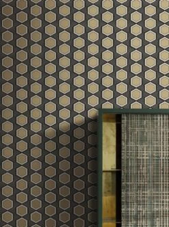 Das ist Geometrie in Perfektion: Goldfarbene Sechsecke, umrandet von weißen und schwarzen Rahmen, auf einem schwarzweiß gestreiften Grund kreieren eine ausdrucksstarke Kulisse für jeden Raum, den Sie mit Uroko dekorieren. Das sachliche Design erhält durch das schimmernde Gelbgold der Hexagone einen ausgeprägten Touch ins Glamouröse und verbindet Form und Farbe zu einem reizvollen, kontrastreichen Gesamtbild.